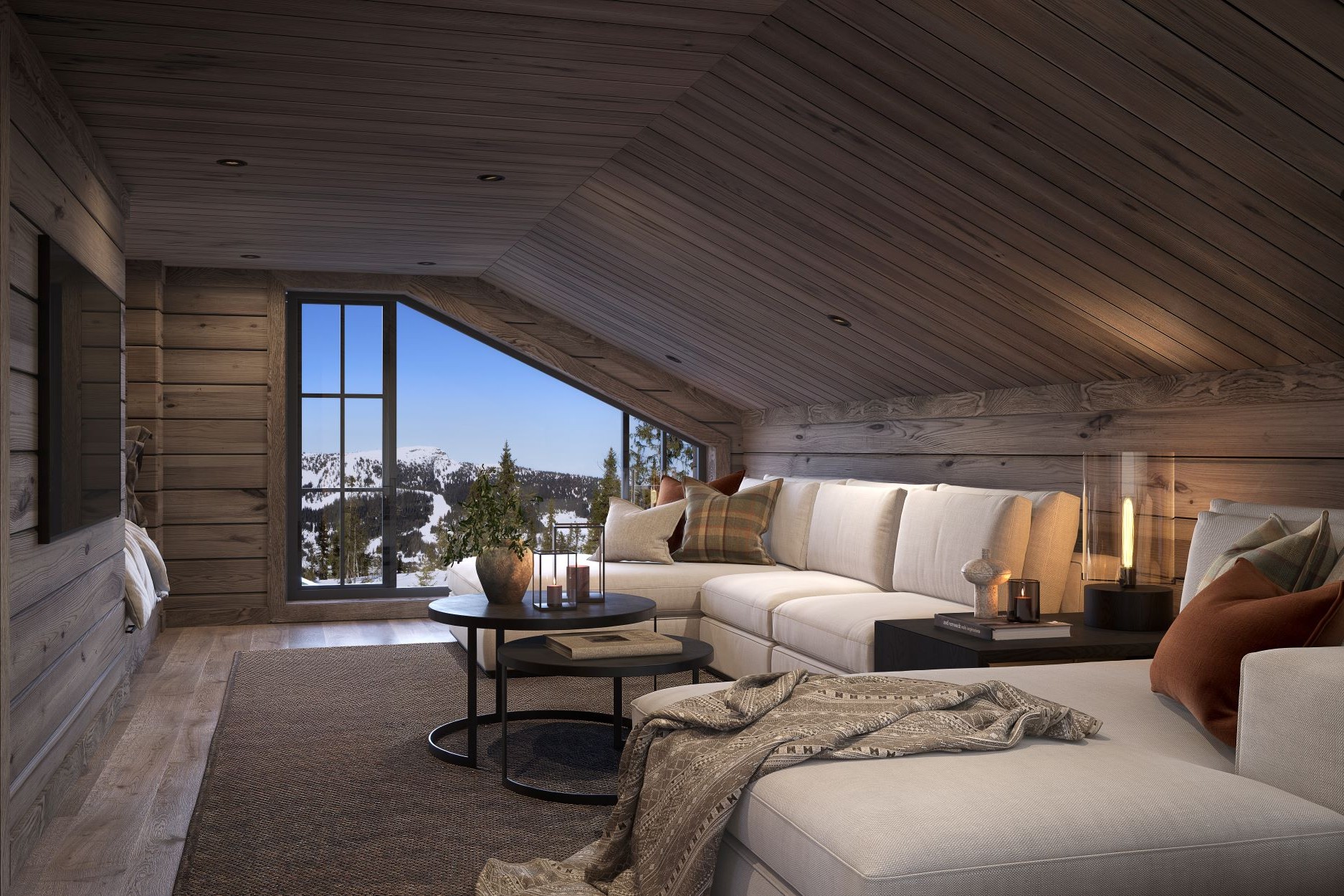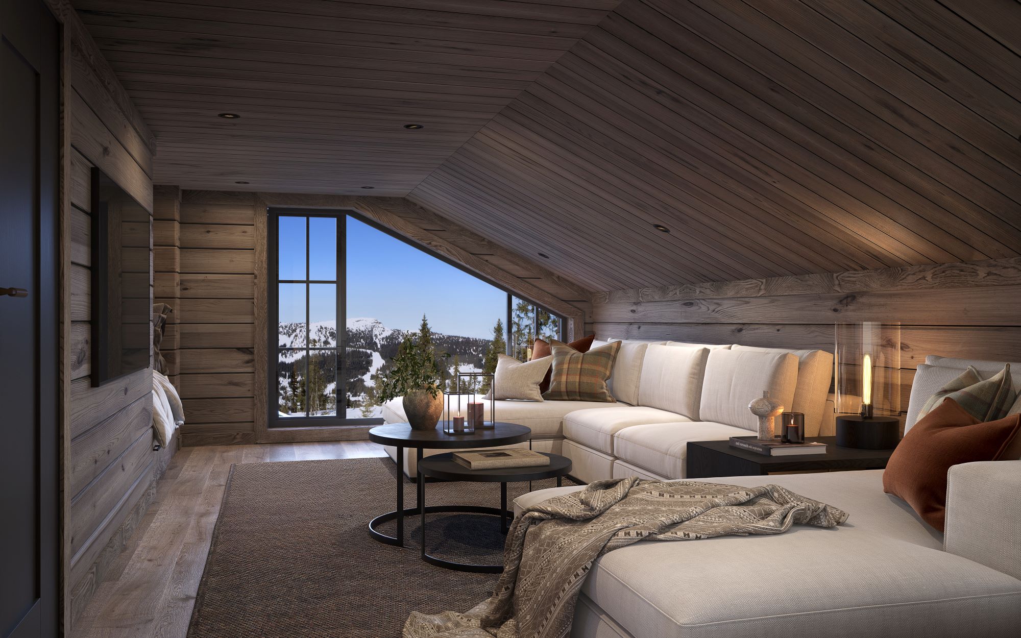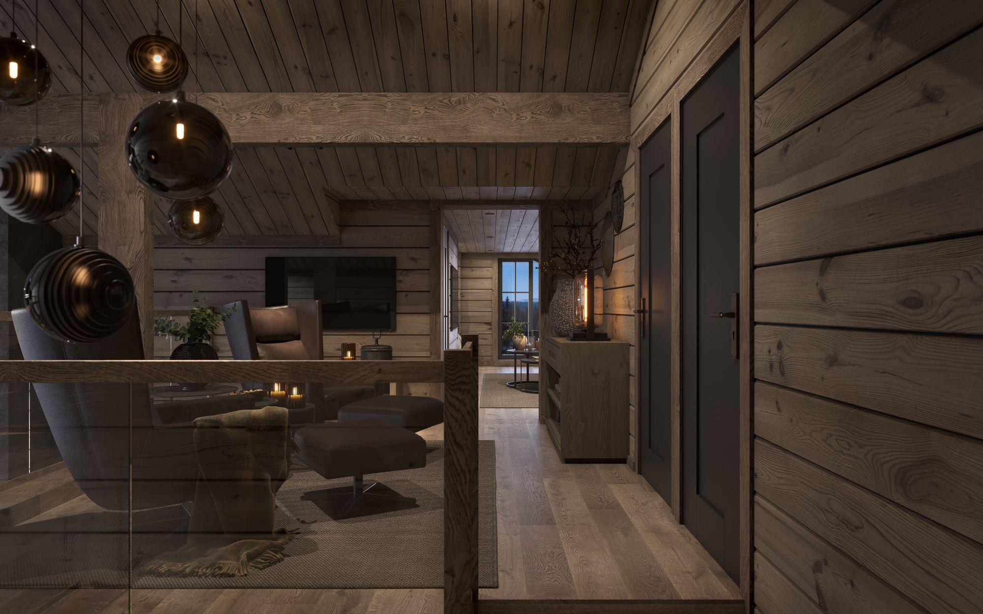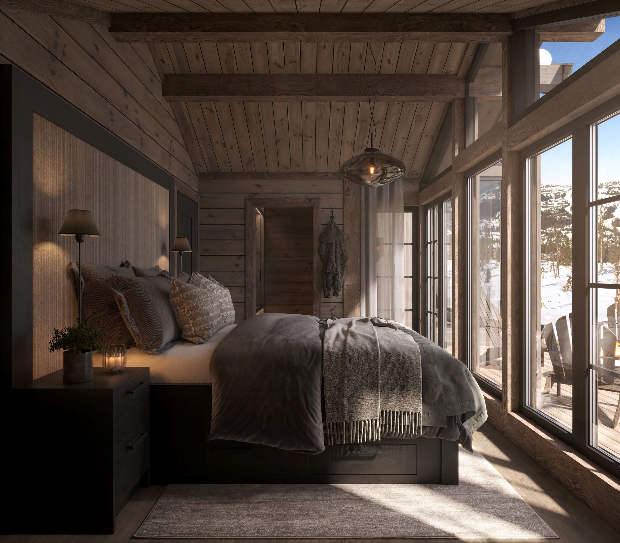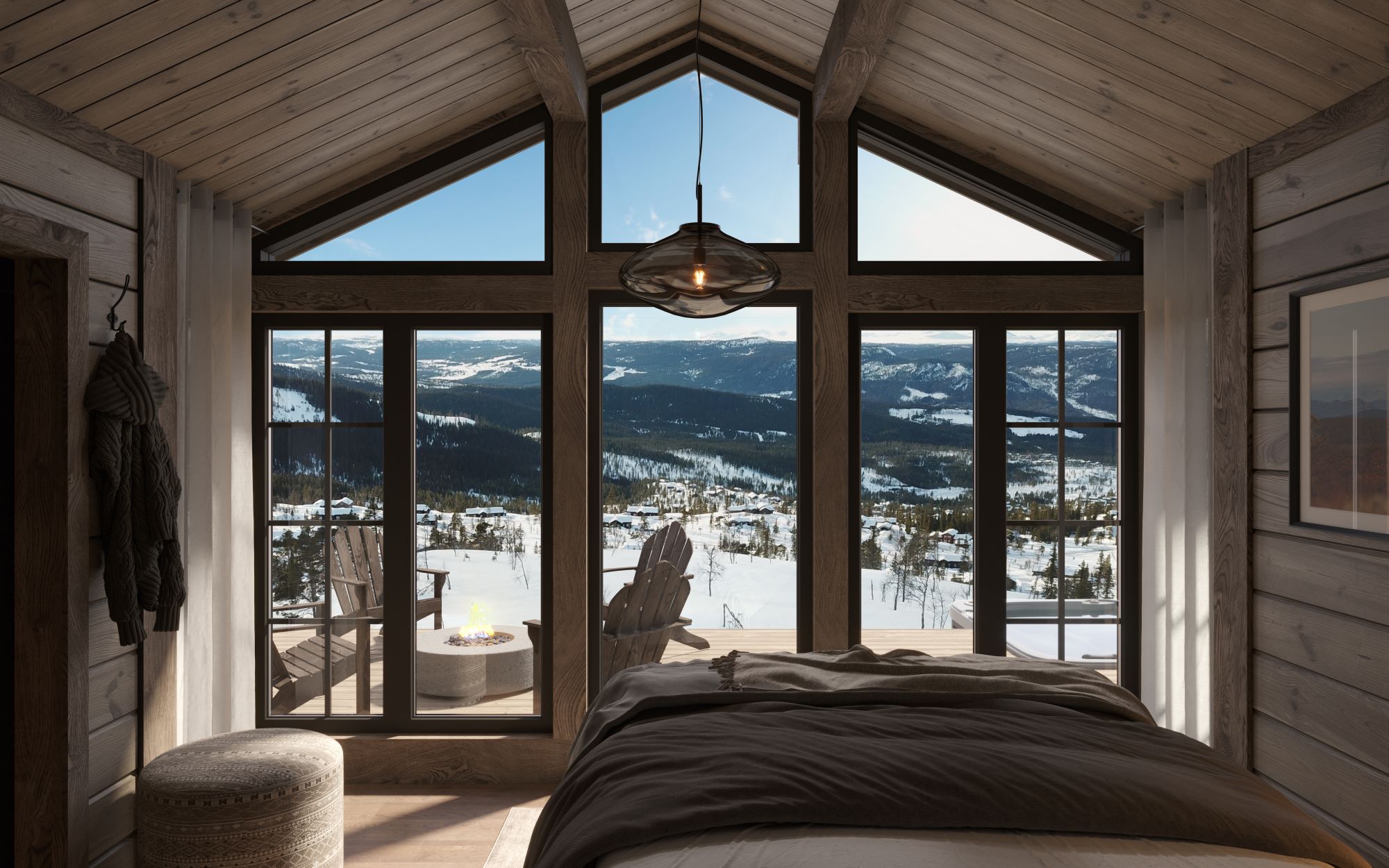 På andre siden av hytta ligger soveromsavdelingen med 3 soverom, bad og badstue. En stor terrasse er plassert på utsiden. Hoved soverommet mot utsiktsiden har skrå takhimling og vinduspanorama i front. Dette soverommet har separat garderoberom med dør til terrassen utenfor. De 2 andre soverommene er plassert mot inngangssiden av hytta.I enden ligger et stort bad med dobbelt servantplass. Dusj, klosett og badstue er avdelt i egen sone og har dør til terrassen utenfor. Terrassen utenfor kan benyttes som en «lounge avdeling» med Jacuzzi, gode stoler rundt et peisbord. Praktisk med nærhet adkomst til badet og badstua.