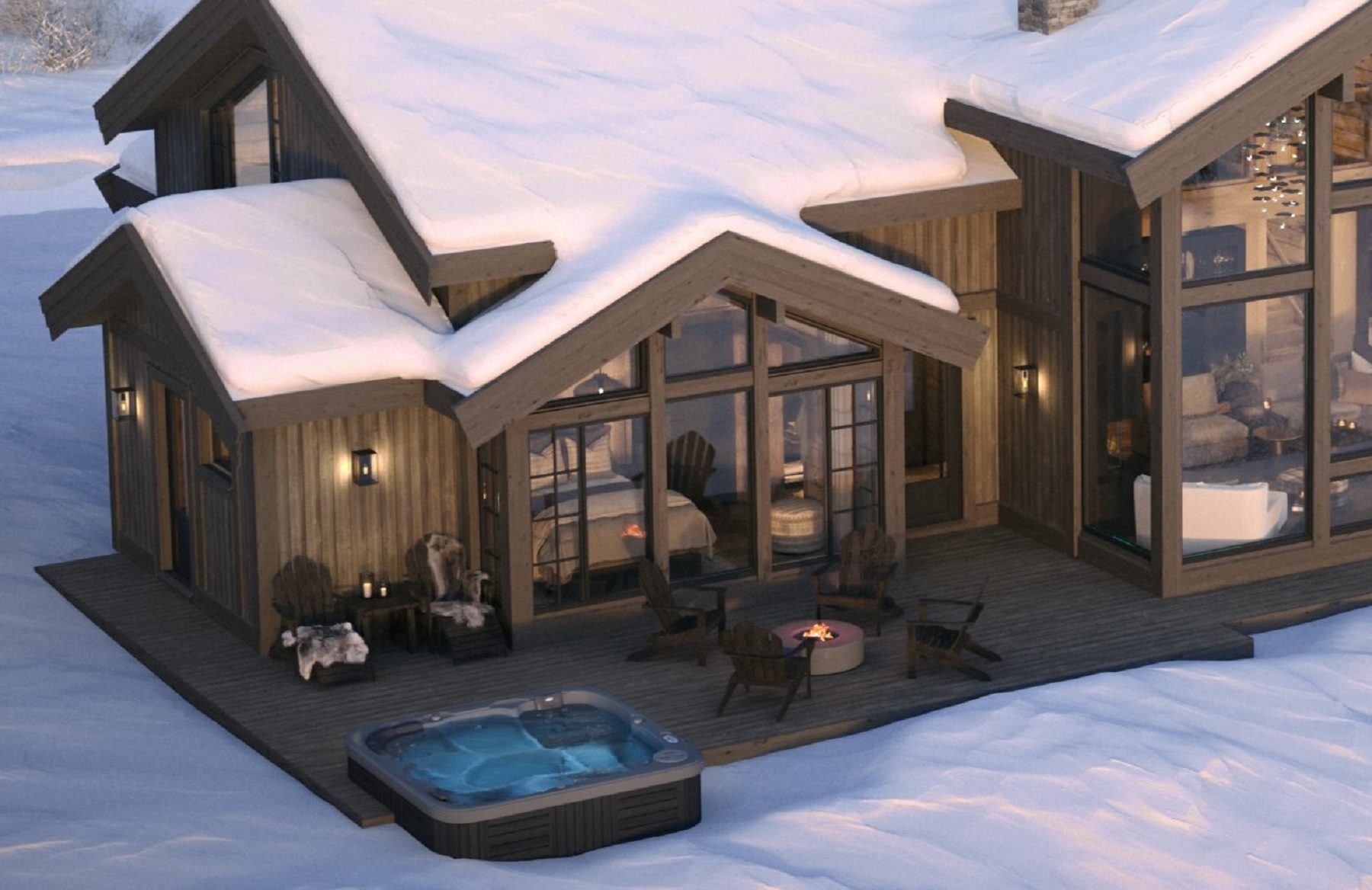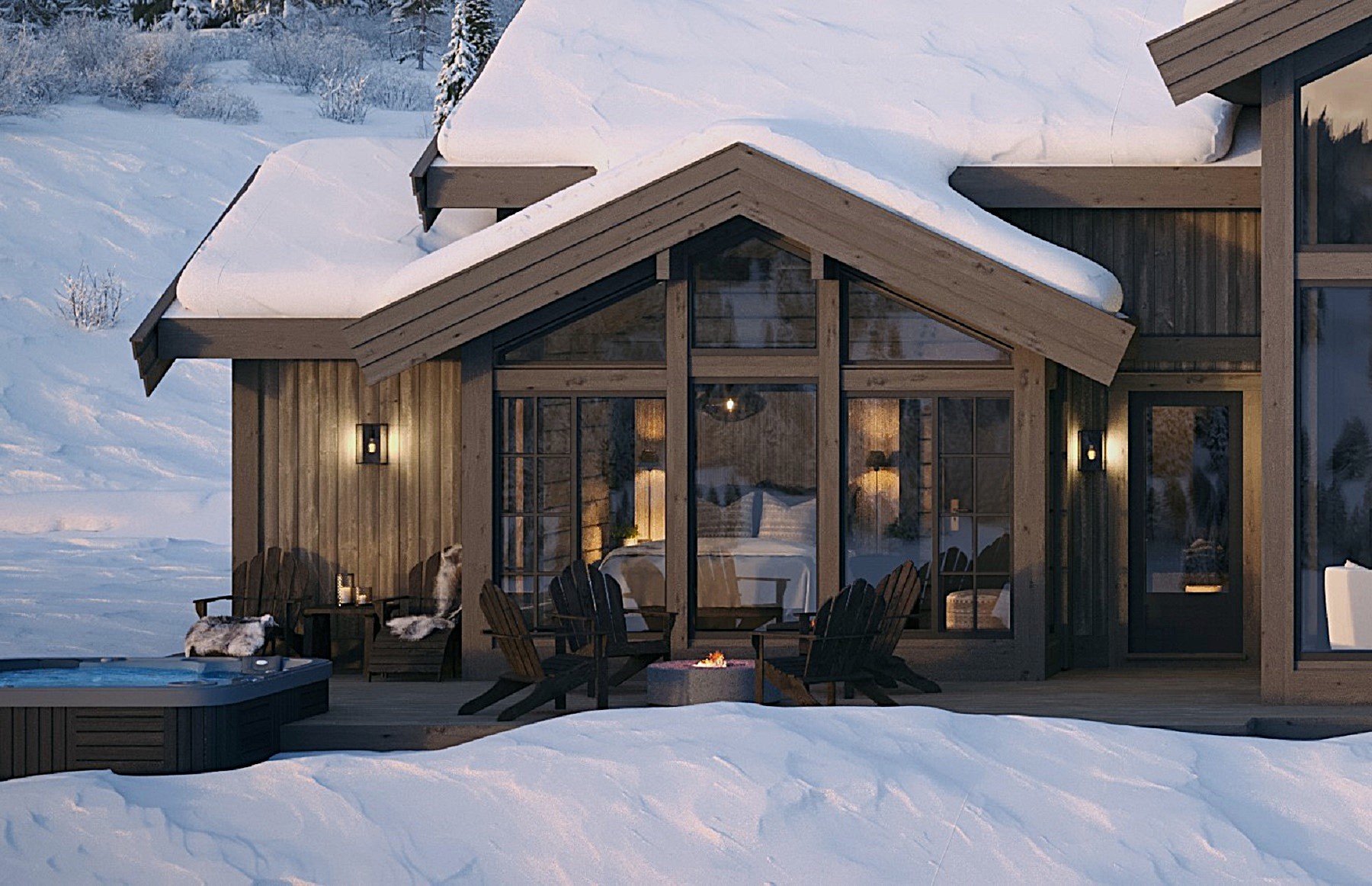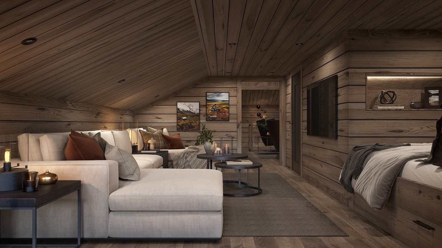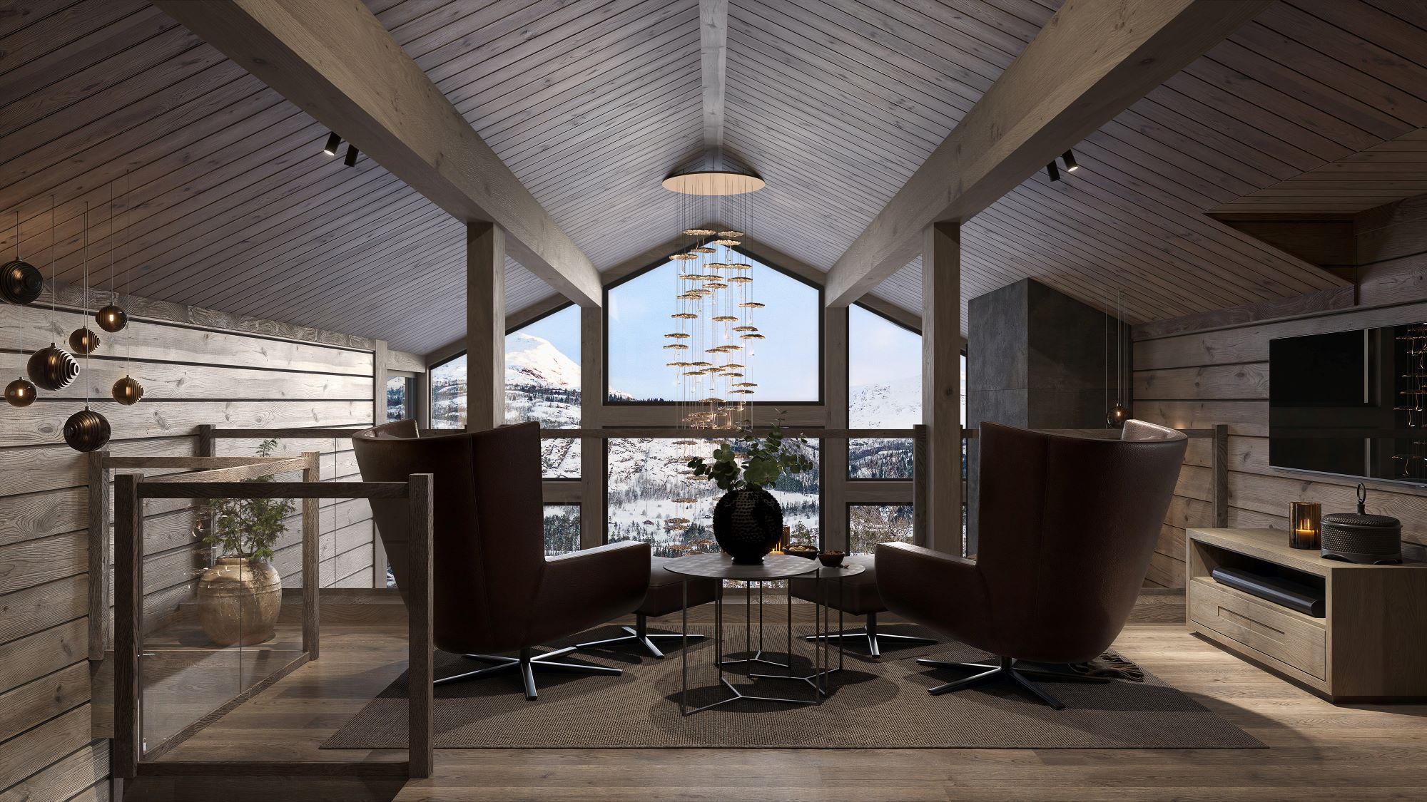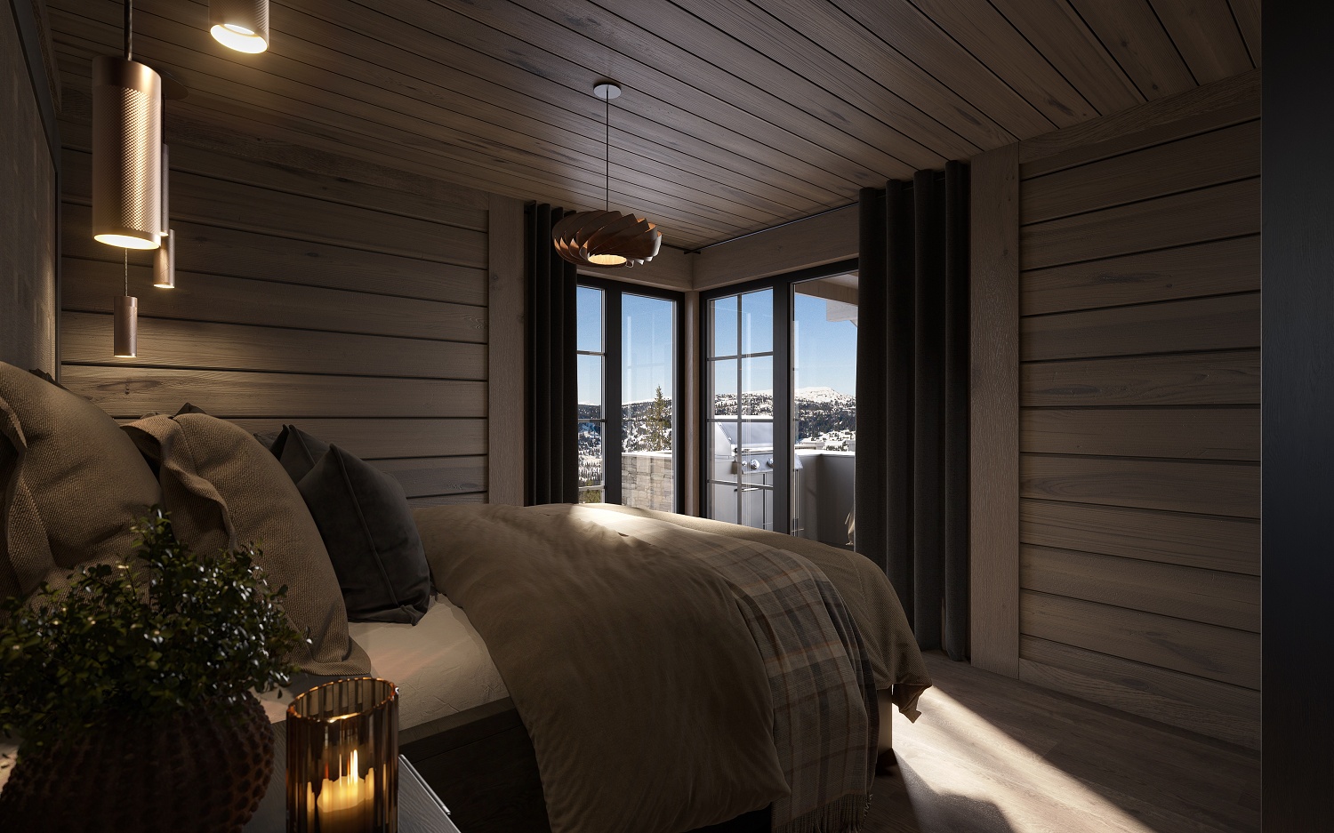 På andre siden av hytta ligger soveromsavdelingen med 3 soverom, bad og badstue. En stor terrasse er plassert på utsiden. Hoved soverommet mot utsiktsiden har skrå takhimling og vinduspanorama i front. Dette soverommet har separat garderoberom med dør til terrassen utenfor. De 2 andre soverommene er plassert mot inngangssiden av hytta.I enden ligger et stort bad med dobbelt servantplass. Dusj, klosett og badstue er avdelt i egen sone og har dør til terrassen utenfor. Terrassen utenfor kan benyttes som en «lounge avdeling» med Jacuzzi, gode stoler rundt et peisbord. Praktisk med nærhet adkomst til badet og badstua.