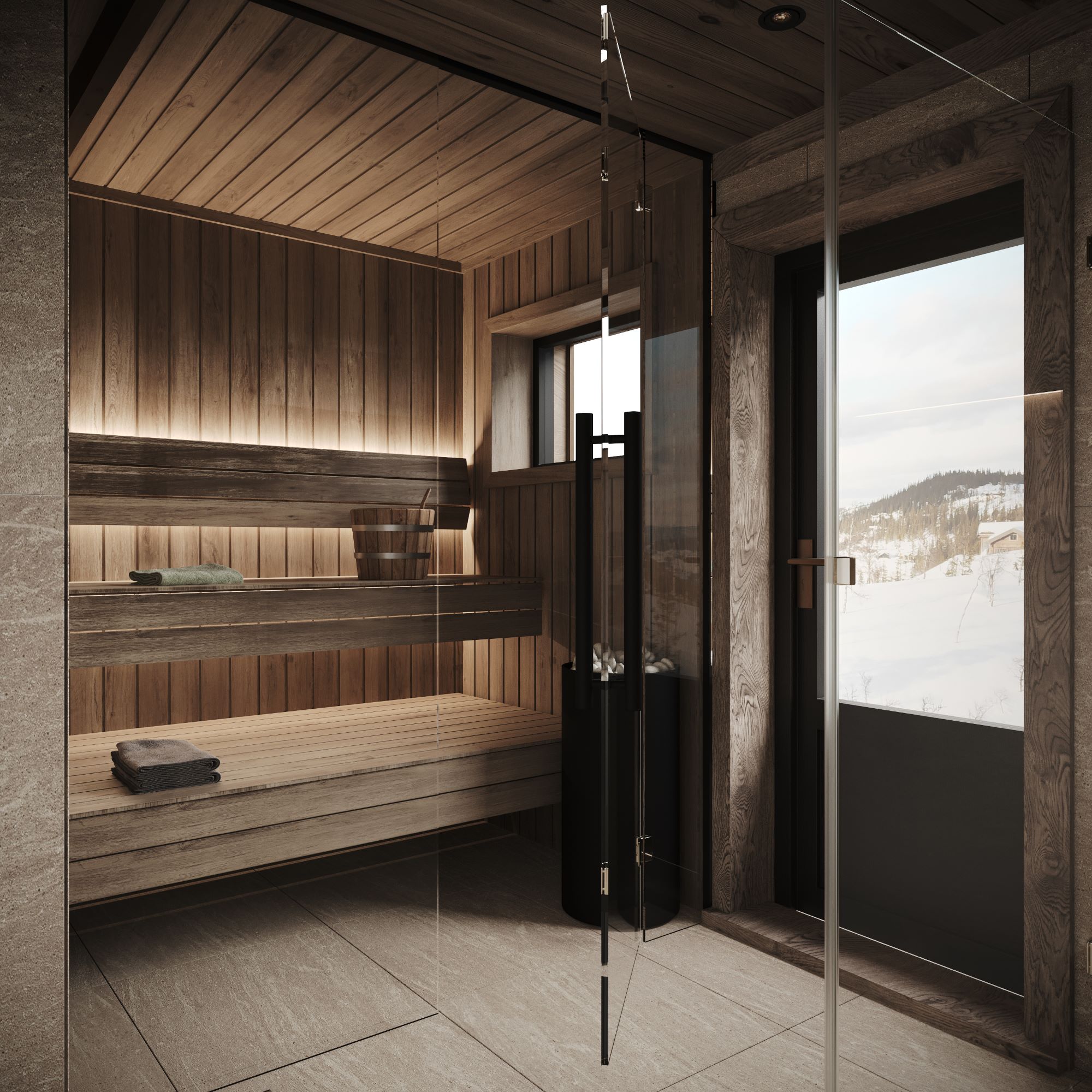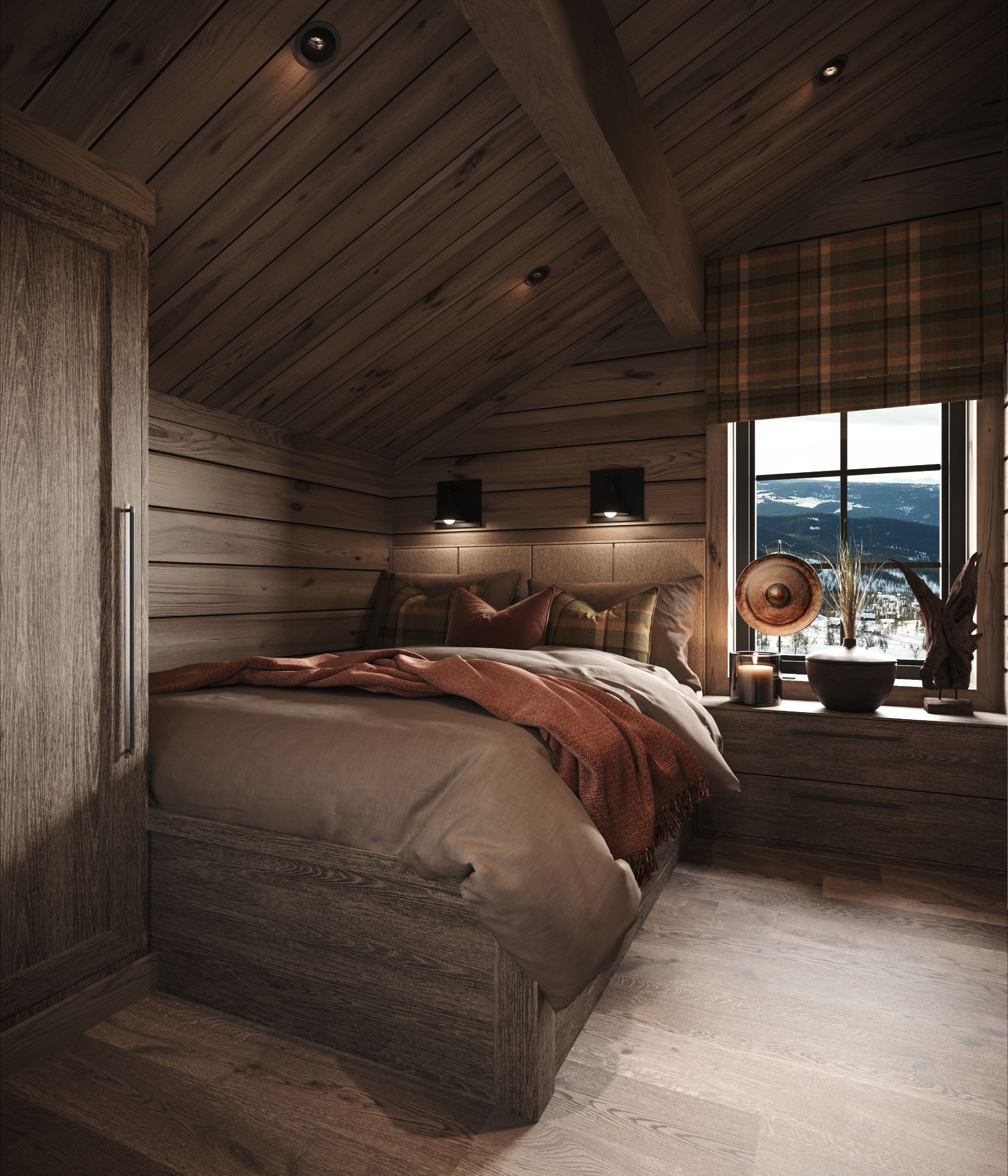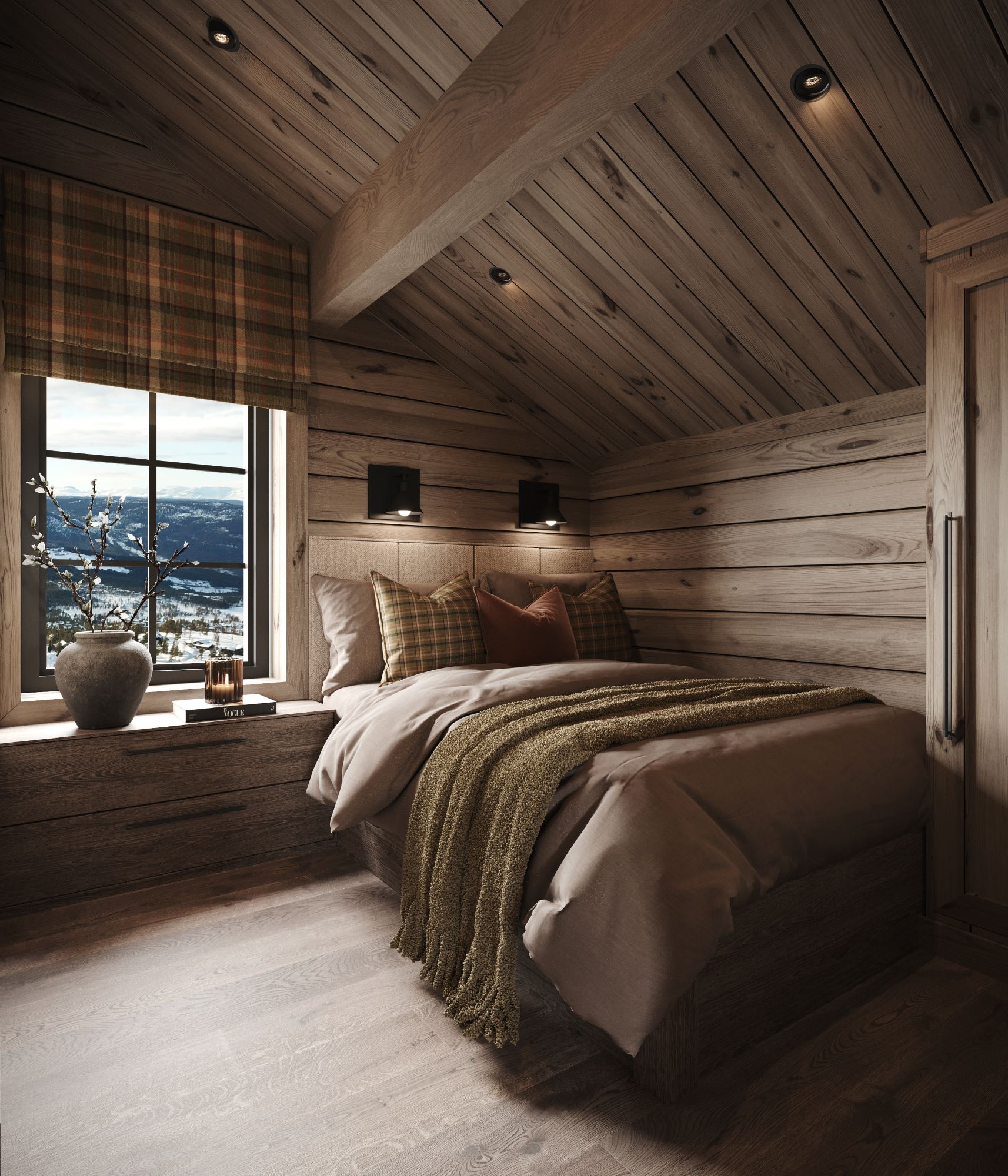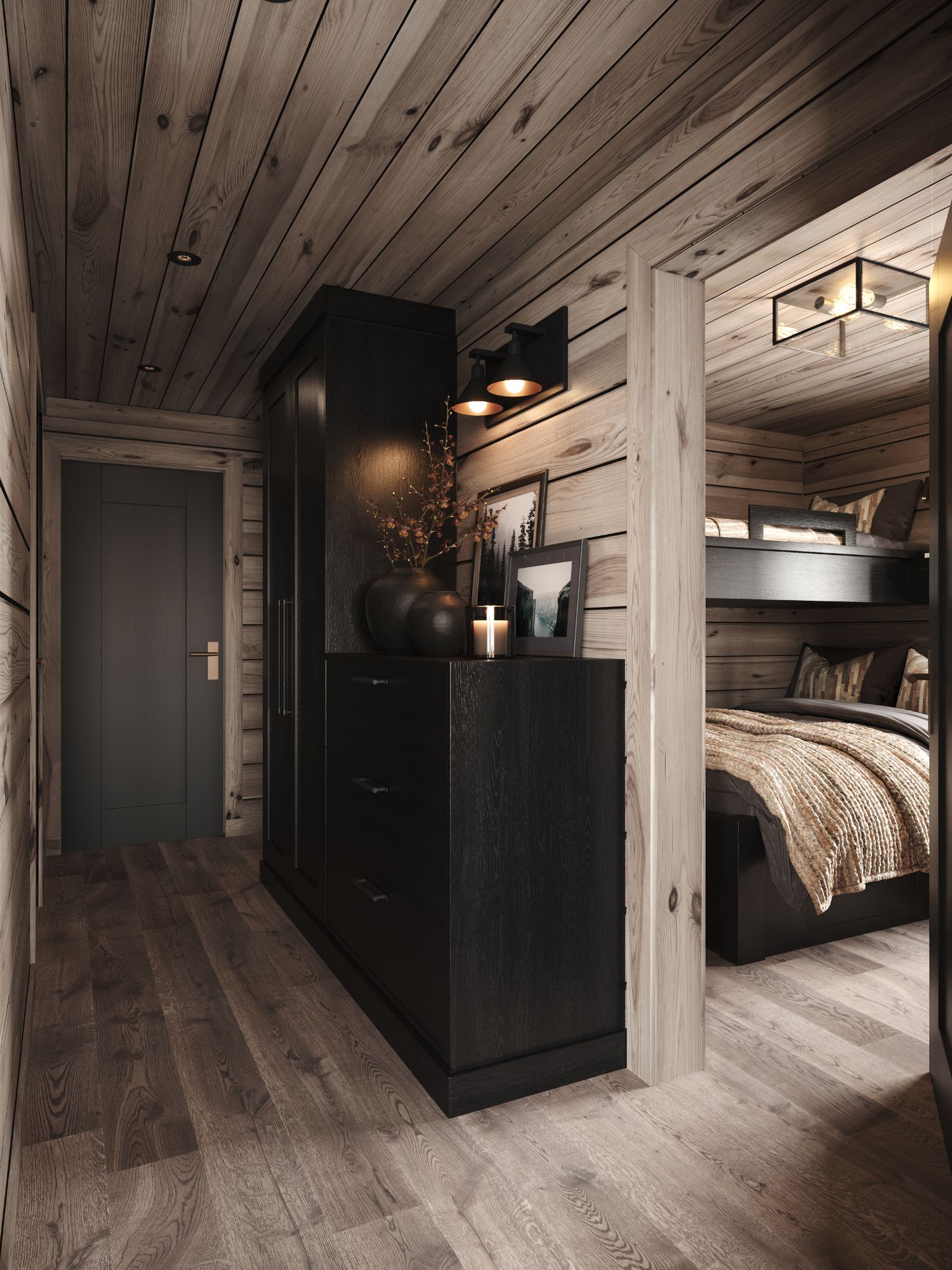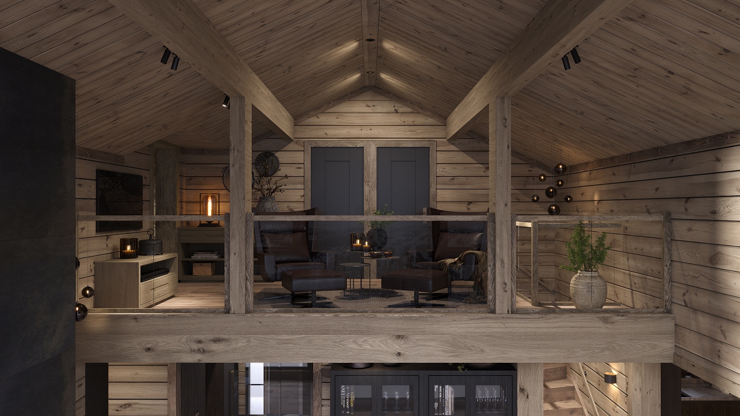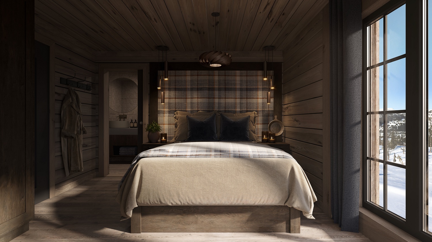 På andre siden av hytta ligger soveromsavdelingen med 3 soverom, bad og badstue. En stor terrasse er plassert på utsiden. Hoved soverommet mot utsiktsiden har skrå takhimling og vinduspanorama i front. Dette soverommet har separat garderoberom med dør til terrassen utenfor. De 2 andre soverommene er plassert mot inngangssiden av hytta.I enden ligger et stort bad med dobbelt servantplass. Dusj, klosett og badstue er avdelt i egen sone og har dør til terrassen utenfor. Terrassen utenfor kan benyttes som en «lounge avdeling» med Jacuzzi, gode stoler rundt et peisbord. Praktisk med nærhet adkomst til badet og badstua.