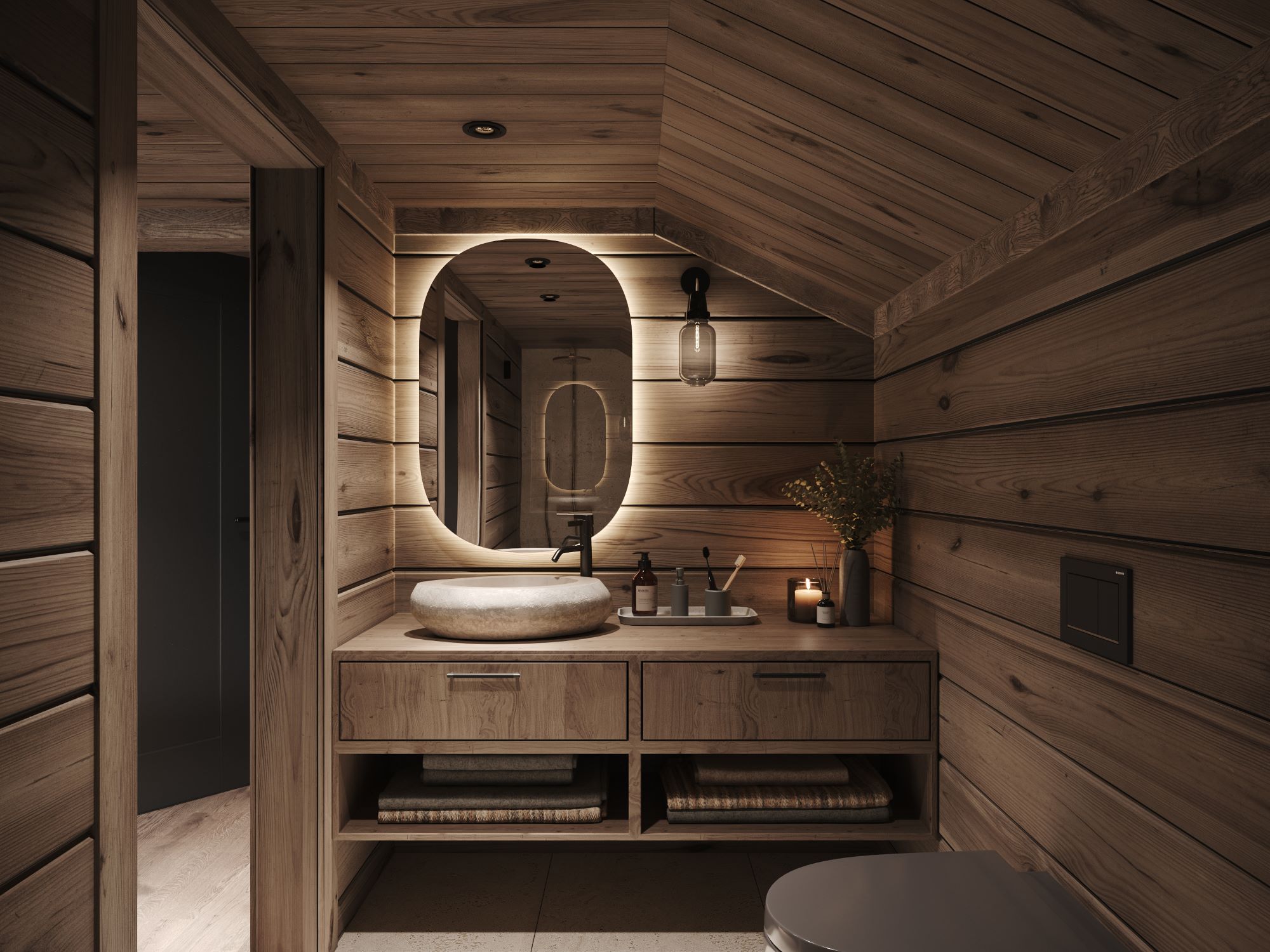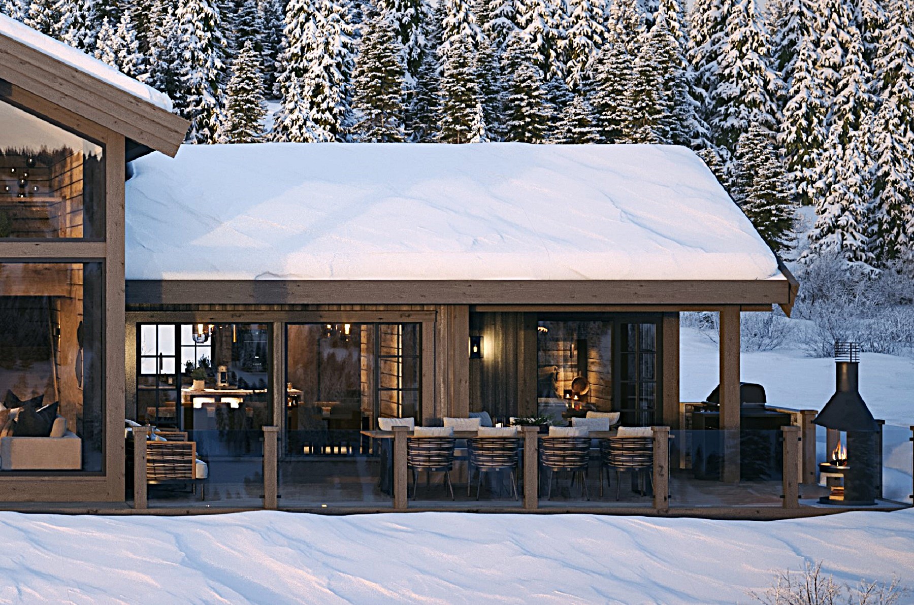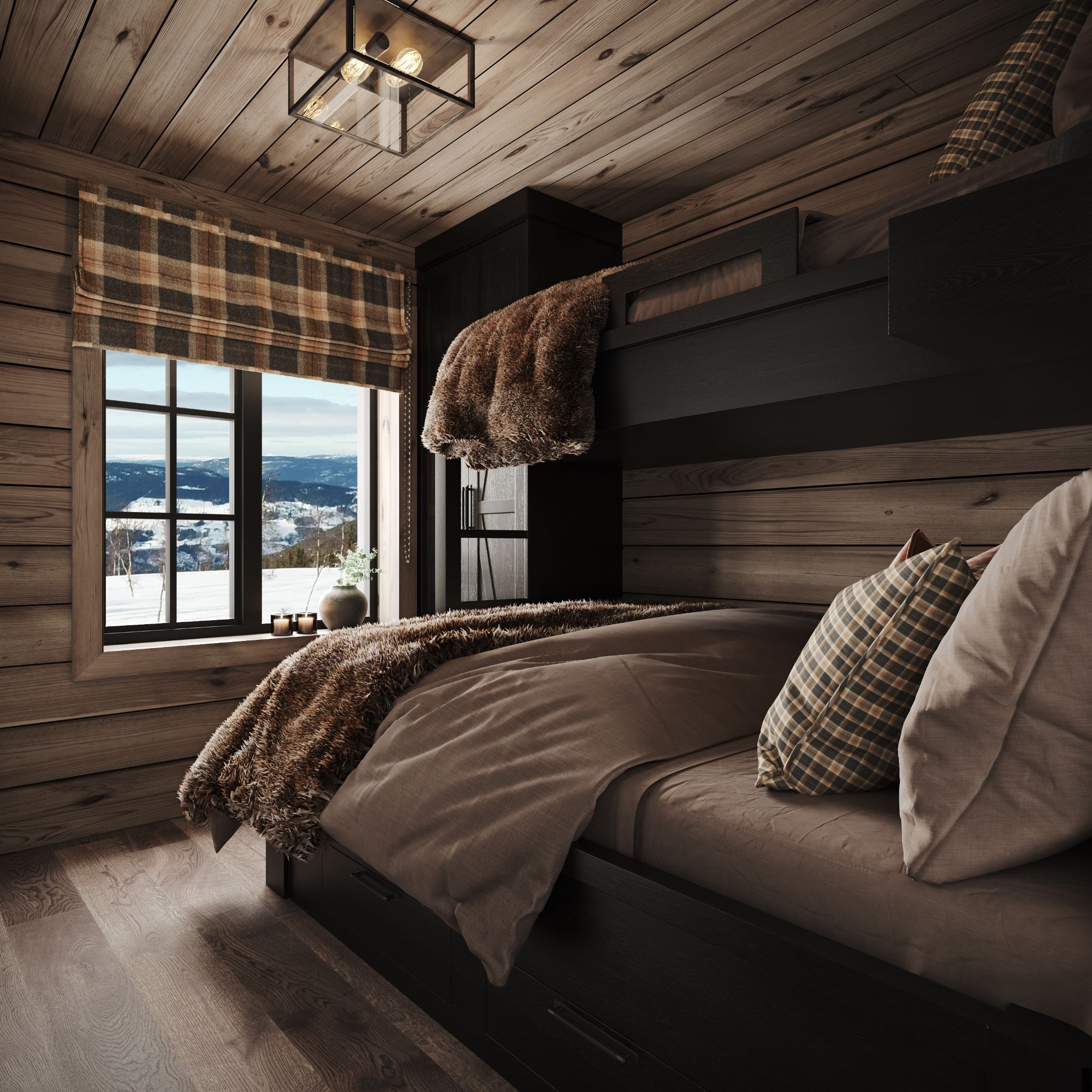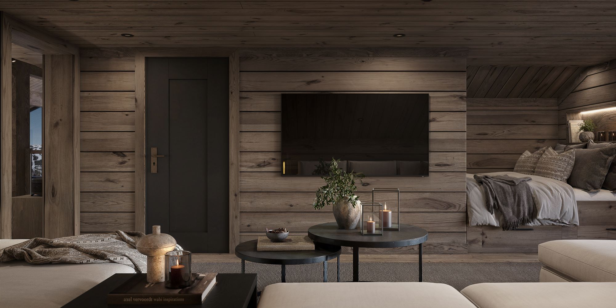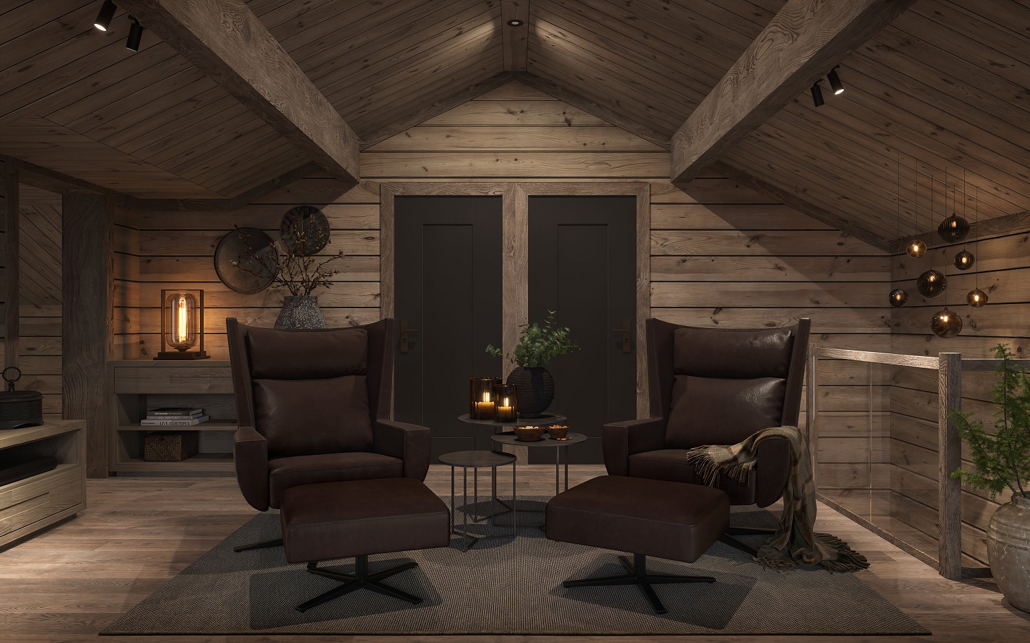 På andre siden av hytta ligger soveromsavdelingen med 3 soverom, bad og badstue. En stor terrasse er plassert på utsiden. Hoved soverommet mot utsiktsiden har skrå takhimling og vinduspanorama i front. Dette soverommet har separat garderoberom med dør til terrassen utenfor. De 2 andre soverommene er plassert mot inngangssiden av hytta.I enden ligger et stort bad med dobbelt servantplass. Dusj, klosett og badstue er avdelt i egen sone og har dør til terrassen utenfor. Terrassen utenfor kan benyttes som en «lounge avdeling» med Jacuzzi, gode stoler rundt et peisbord. Praktisk med nærhet adkomst til badet og badstua.