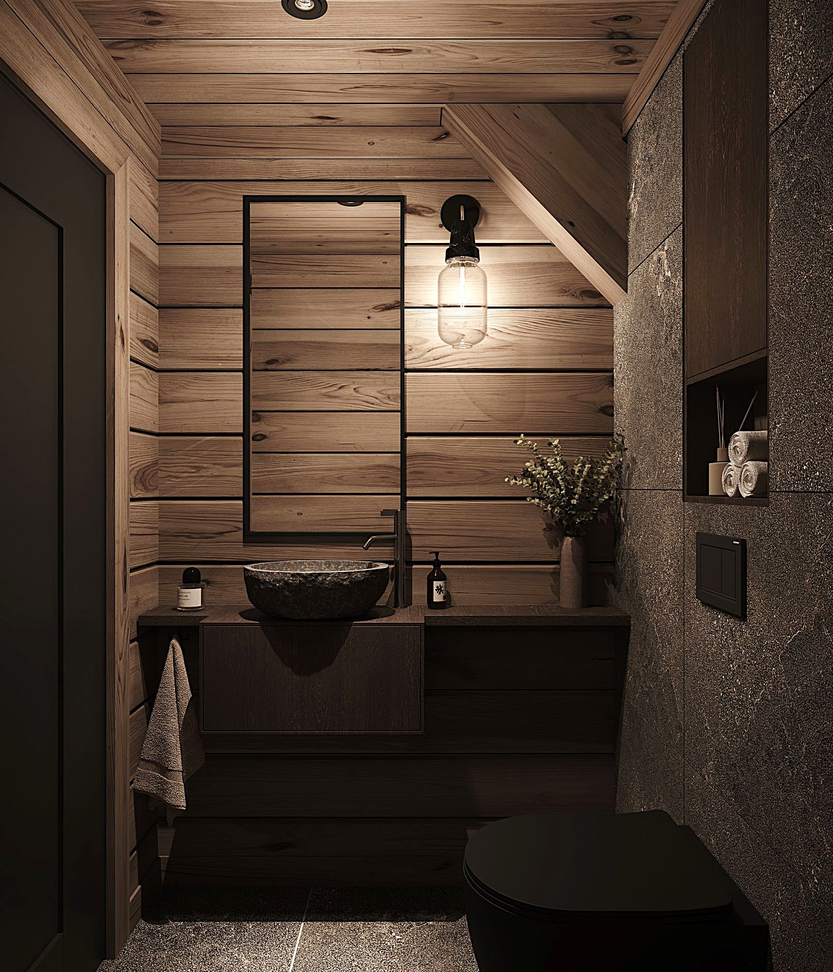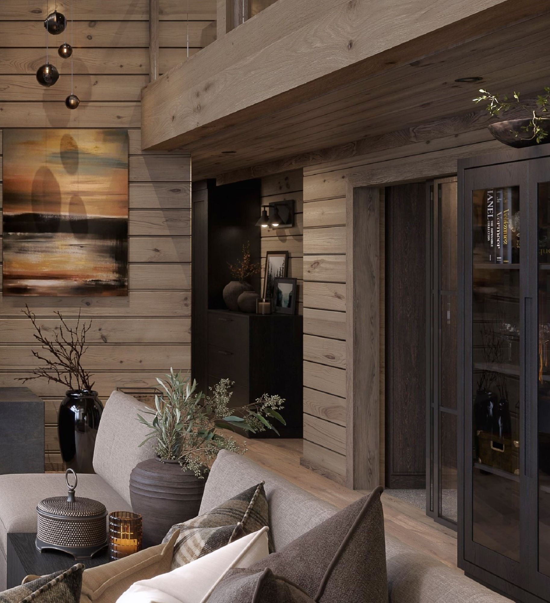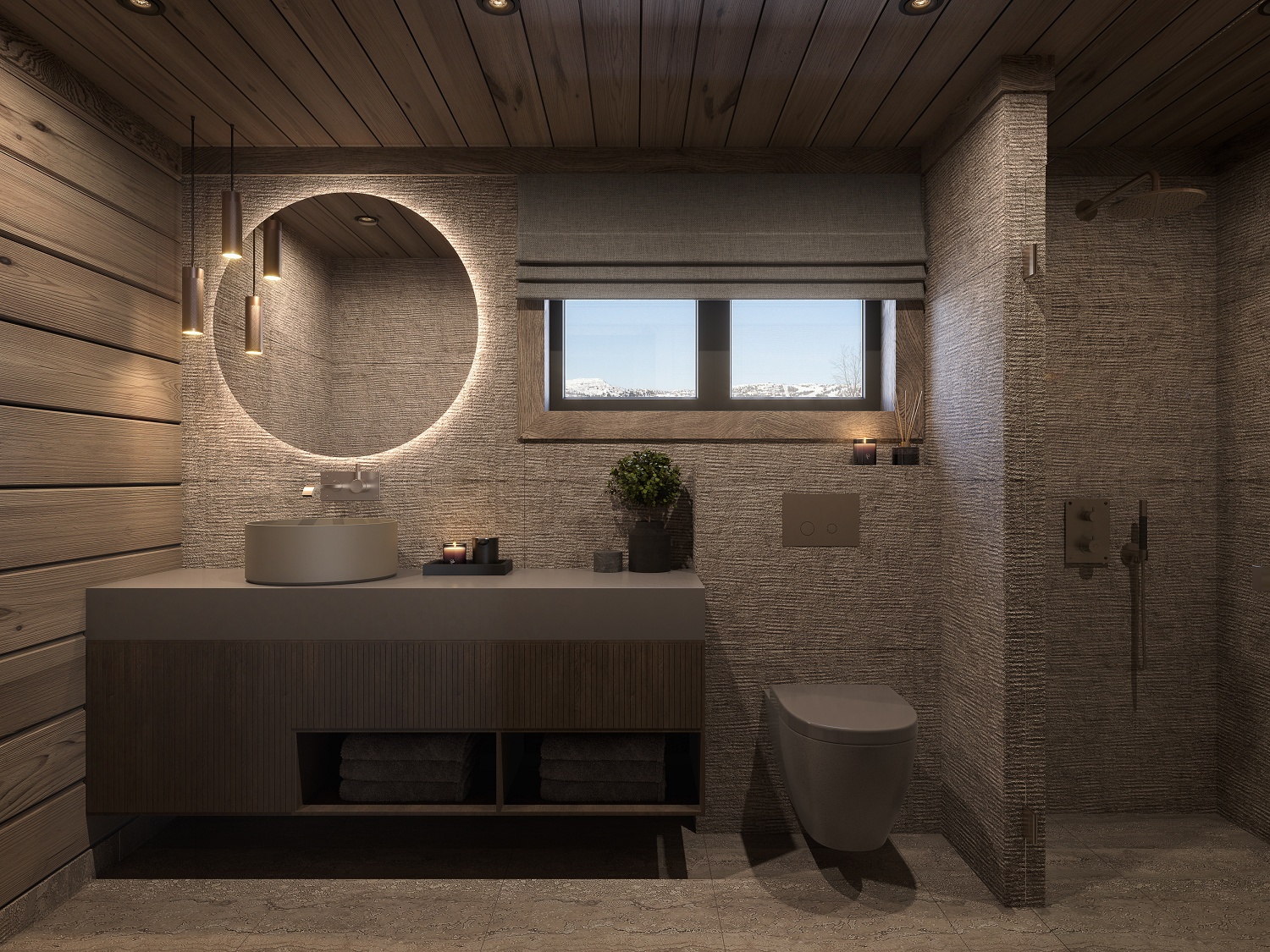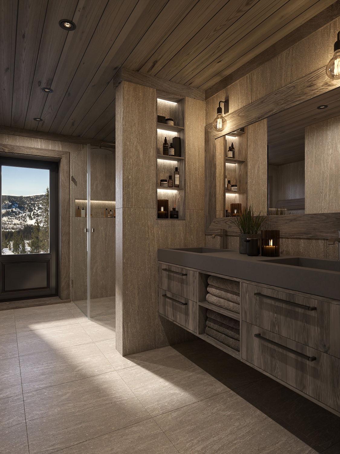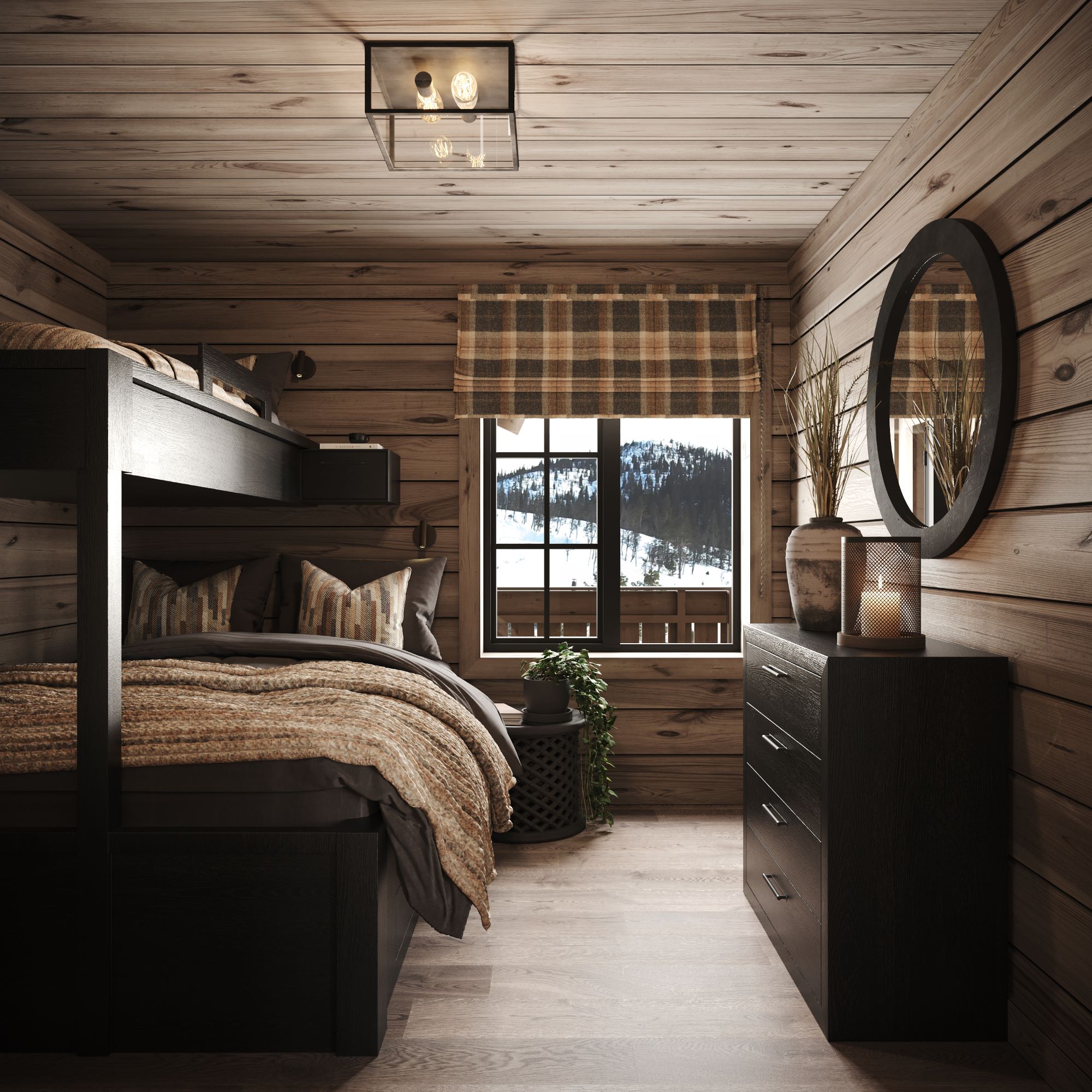 På andre siden av hytta ligger soveromsavdelingen med 3 soverom, bad og badstue. En stor terrasse er plassert på utsiden. Hoved soverommet mot utsiktsiden har skrå takhimling og vinduspanorama i front. Dette soverommet har separat garderoberom med dør til terrassen utenfor. De 2 andre soverommene er plassert mot inngangssiden av hytta.I enden ligger et stort bad med dobbelt servantplass. Dusj, klosett og badstue er avdelt i egen sone og har dør til terrassen utenfor. Terrassen utenfor kan benyttes som en «lounge avdeling» med Jacuzzi, gode stoler rundt et peisbord. Praktisk med nærhet adkomst til badet og badstua.
