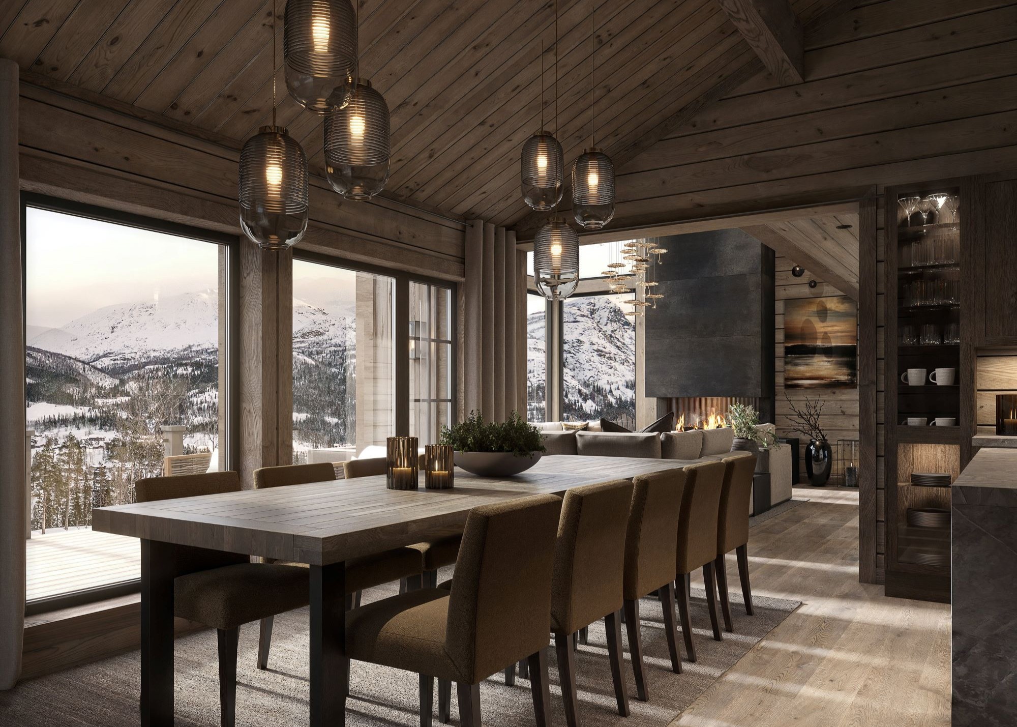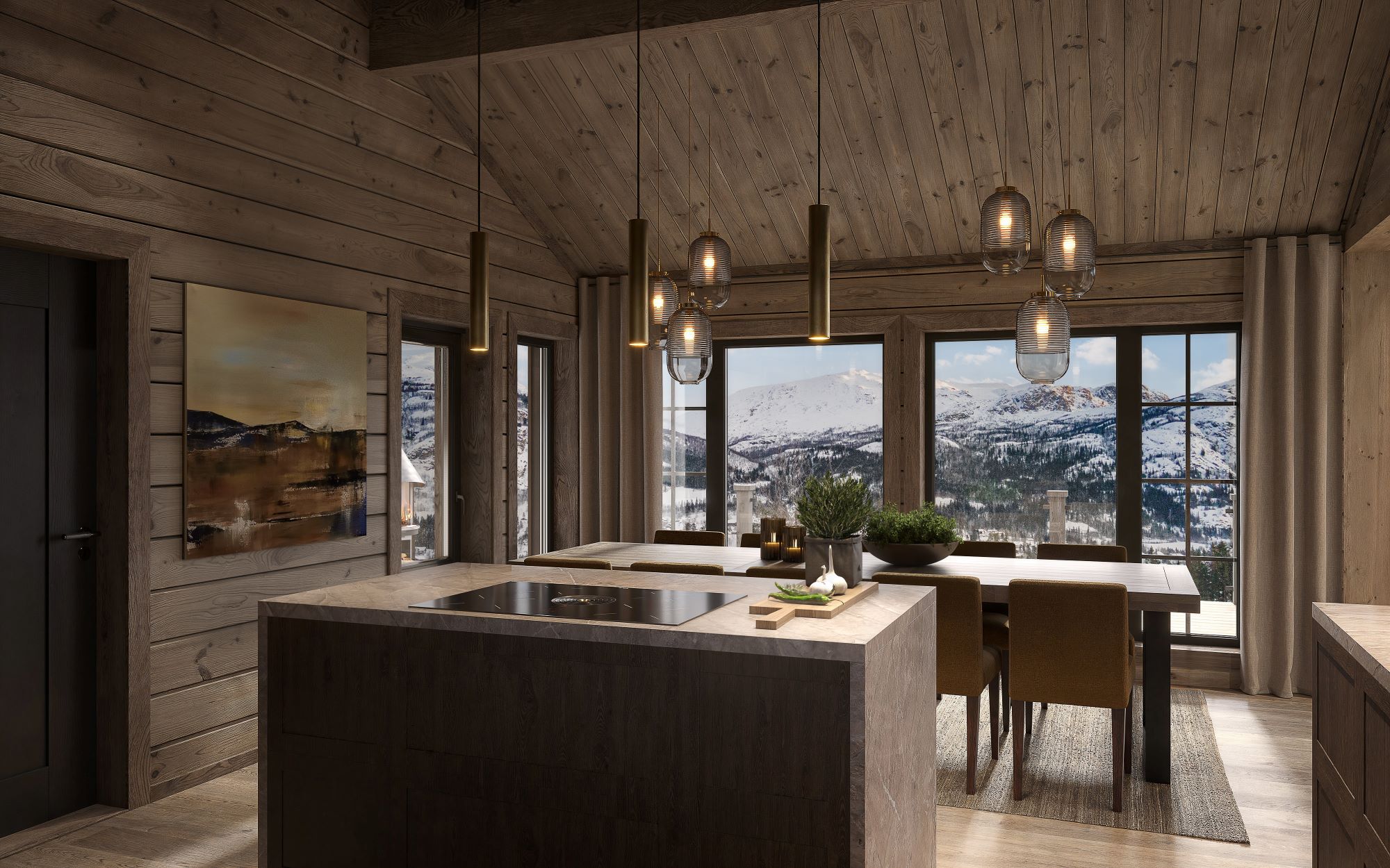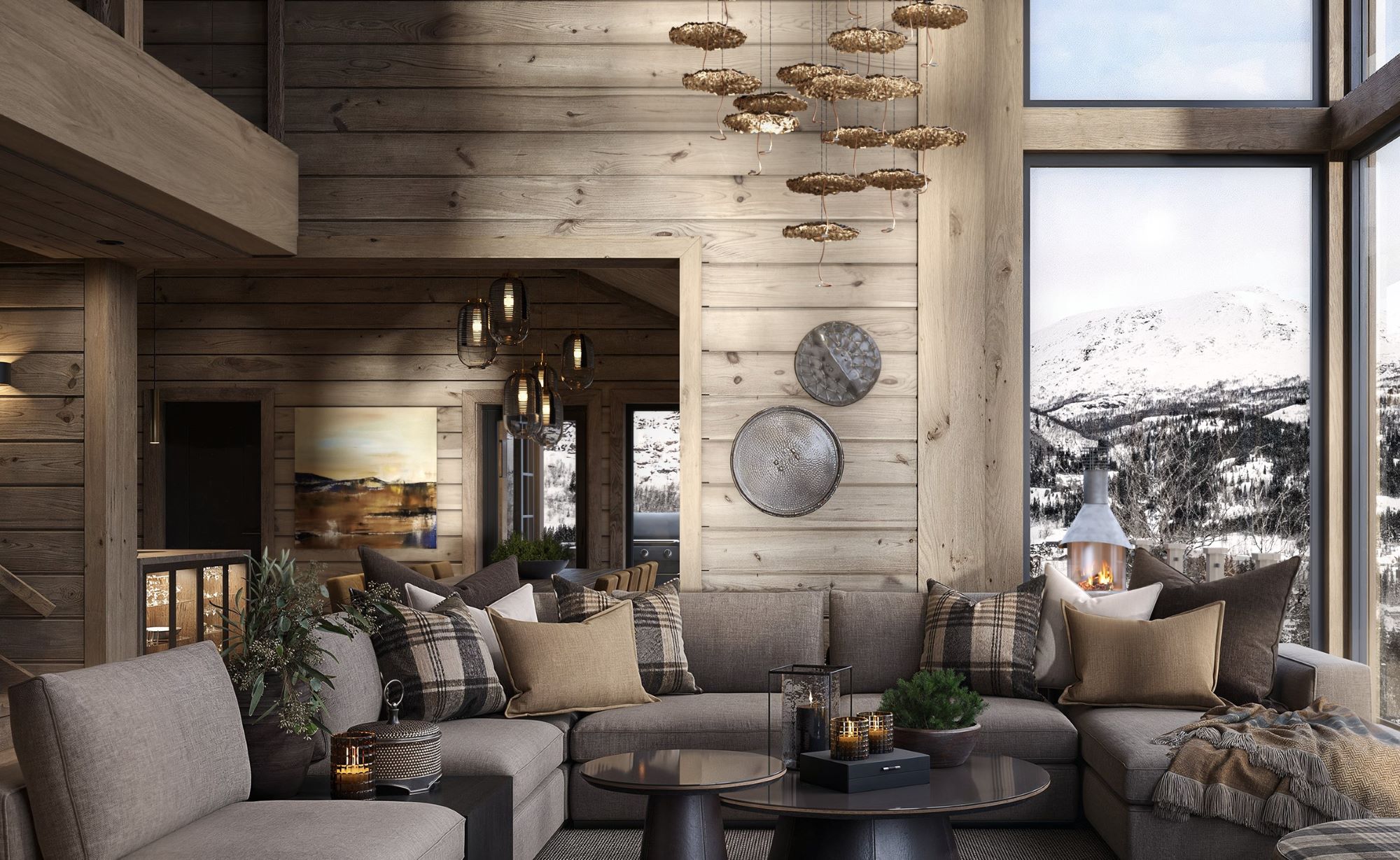 Stua har høy takhimling med og store vindusflater som gir deg en spesiell følelse av å «være i ett» med fjellnatur og himmel. Peisen er plassert nær sofaplassen slik at du kan nyte flammene sammen med fjellnaturen. Kjøkkenet og spisebordet er plassert ved siden av og har vinduer mot utsiktsiden. Fra spisebordet er det også innsyn til peisflammene i stua. Fra kjøkken/spisestue er det dør ut til en stor terrasse. Første del av terrassen er tak overbygd med støpt og skiferbelagt levegg for avskjerming av grillplassen. Ett romslig soverom, med eget praktisk bad, er plassert adskilt fra de andre soverommene fra kjøkken/spisestua.