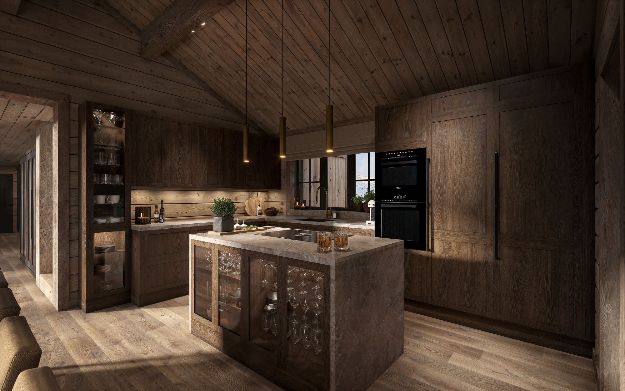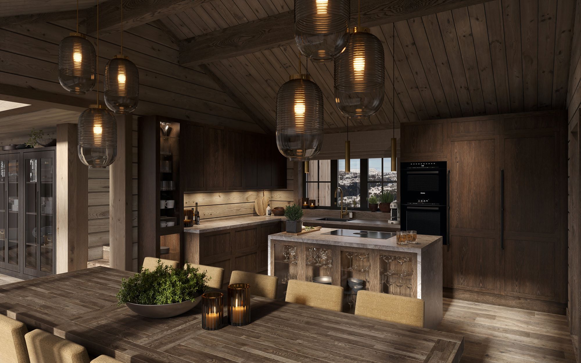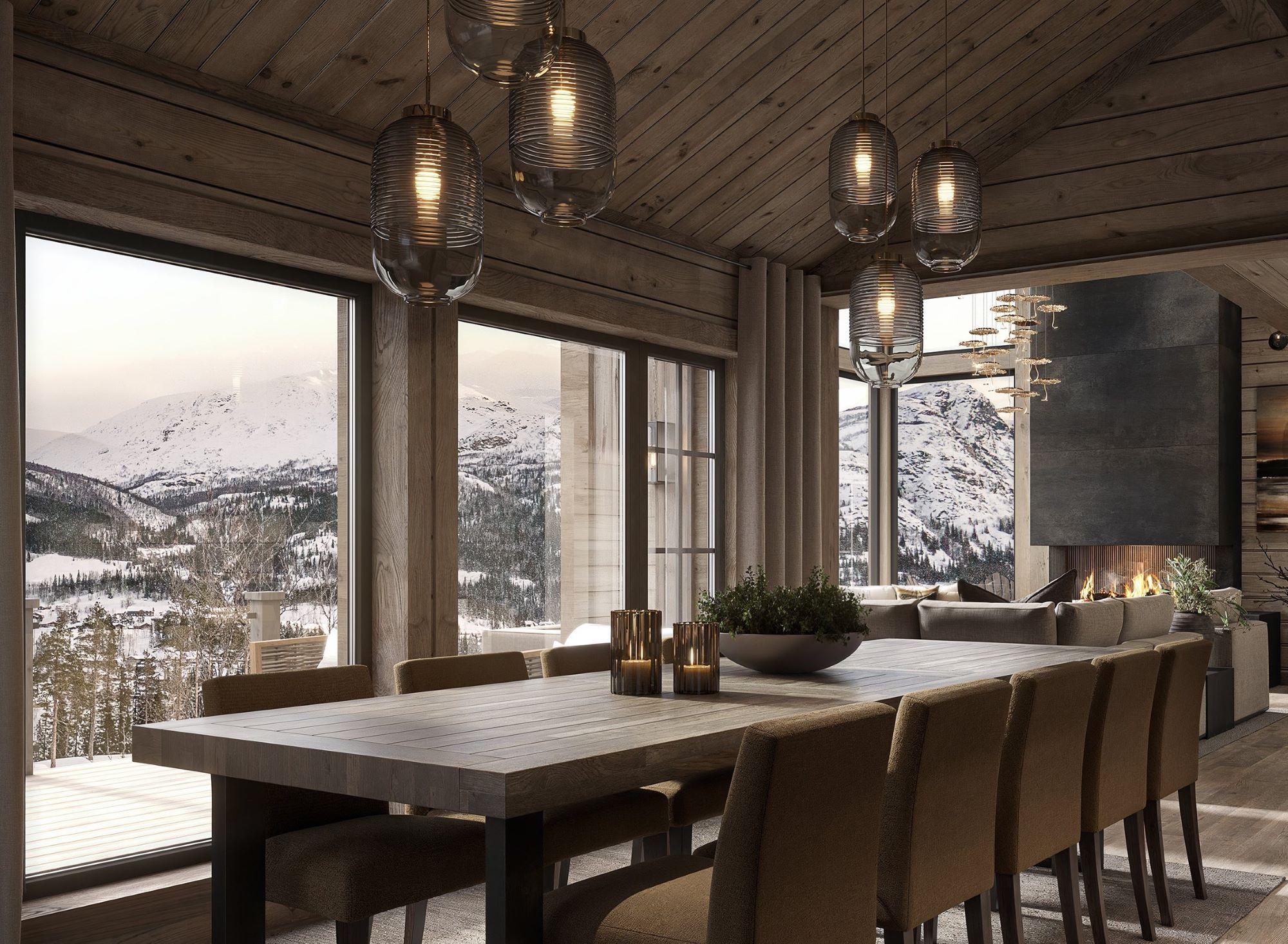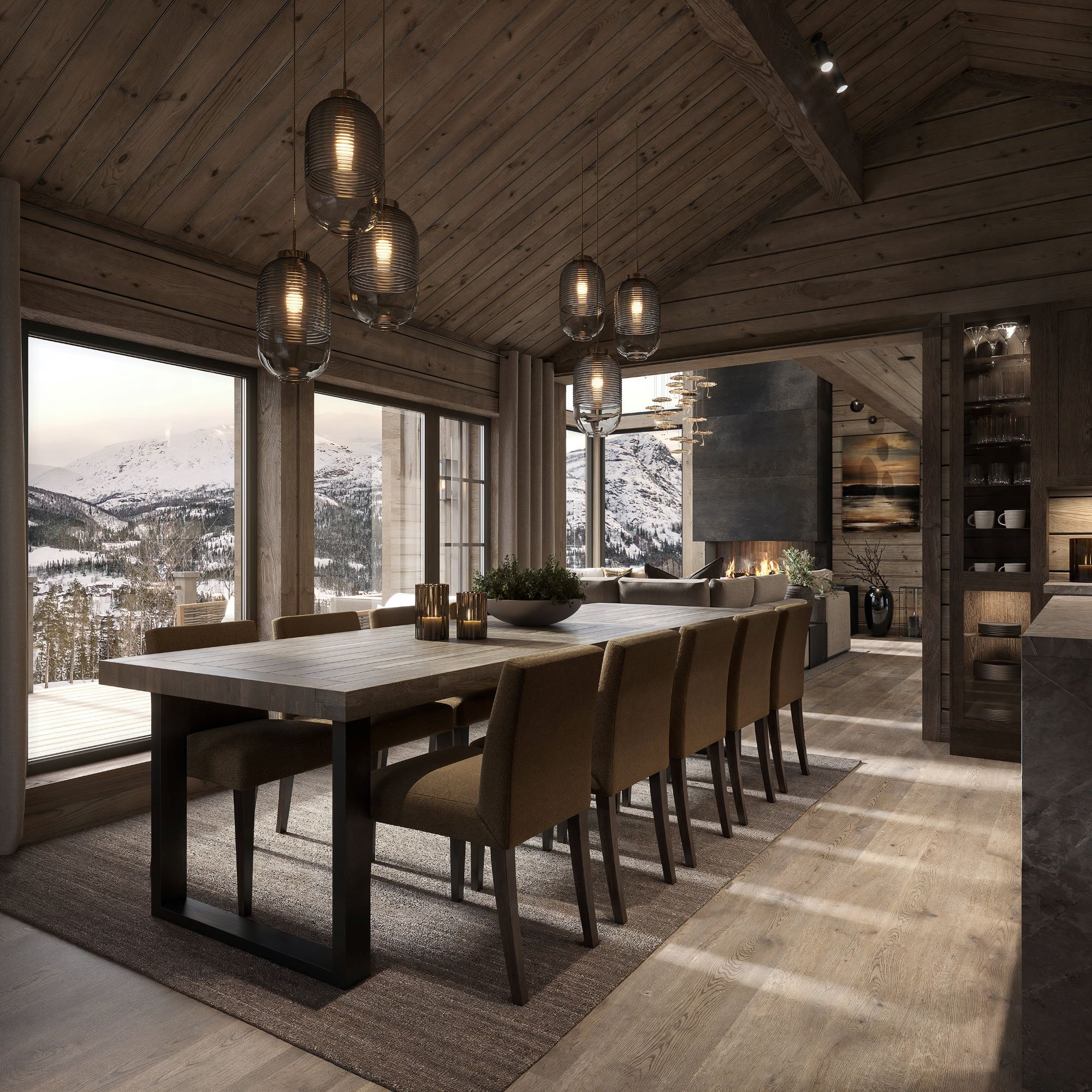 Stua har høy takhimling med og store vindusflater som gir deg en spesiell følelse av å «være i ett» med fjellnatur og himmel. Peisen er plassert nær sofaplassen slik at du kan nyte flammene sammen med fjellnaturen. Kjøkkenet og spisebordet er plassert ved siden av og har vinduer mot utsiktsiden. Fra spisebordet er det også innsyn til peisflammene i stua. Fra kjøkken/spisestue er det dør ut til en stor terrasse. Første del av terrassen er tak overbygd med støpt og skiferbelagt levegg for avskjerming av grillplassen. Ett romslig soverom, med eget praktisk bad, er plassert adskilt fra de andre soverommene fra kjøkken/spisestua.