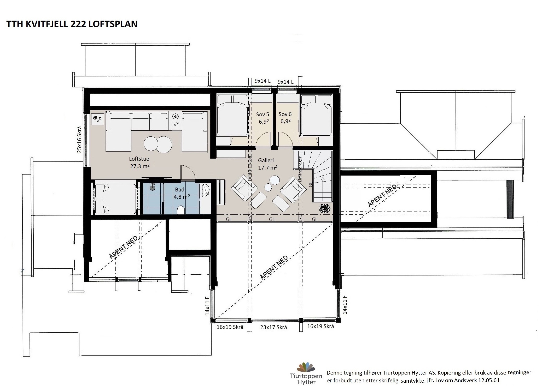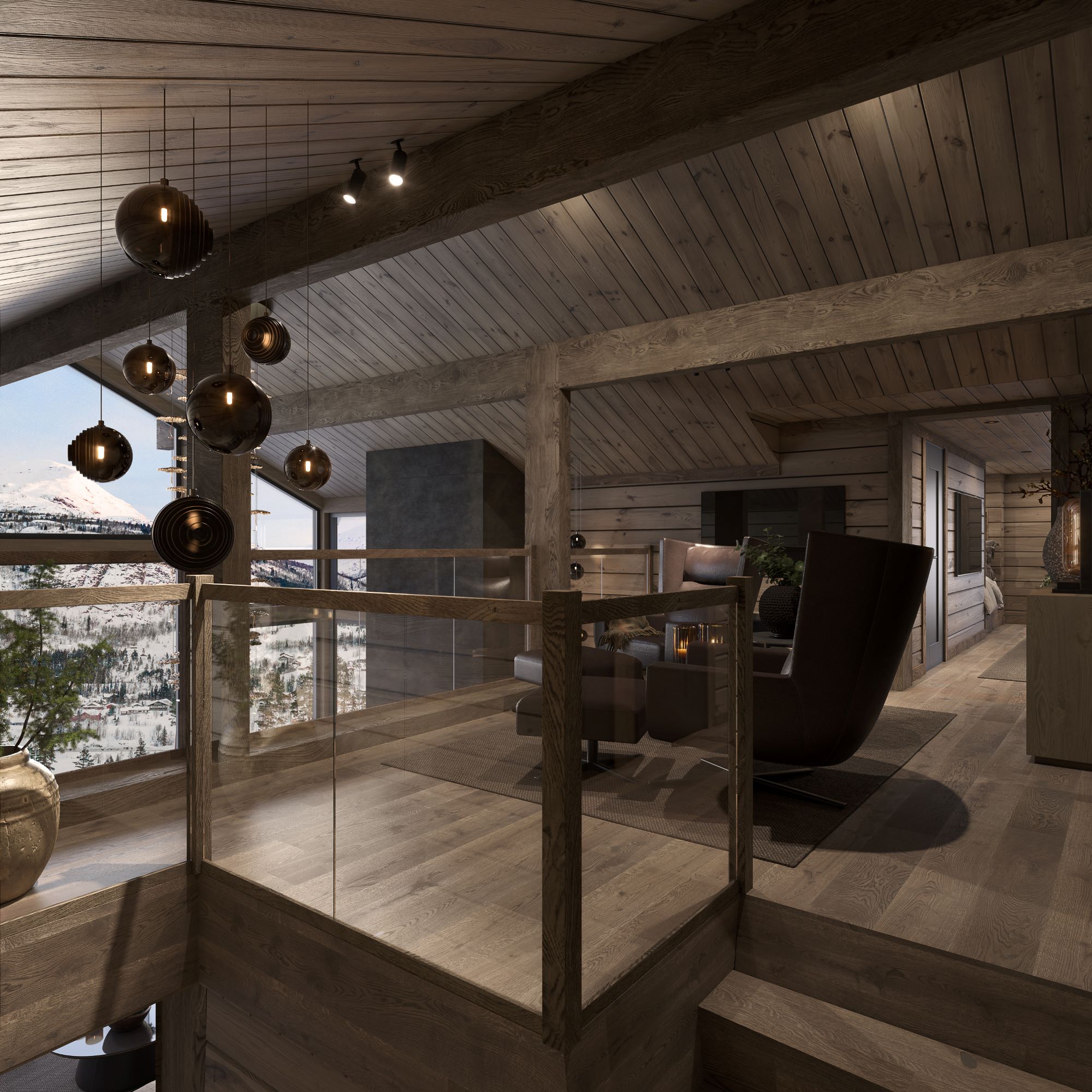 Lofts planet har adkomst via innbygd trapp mellom stua og kjøkken/spisestue. Fra sitteplassene på galleriet kan du nyte ro og utsikt gjennom stuas vinduer, se på TV og samtidig ha kontakt med de som sitter i stua under. Ved siden av galleriet finner du en hyggelig stue med romslig sofaplass og mulighet for en alkoveseng eller daybed. Fra stua er det dør til lofts planets baderom.