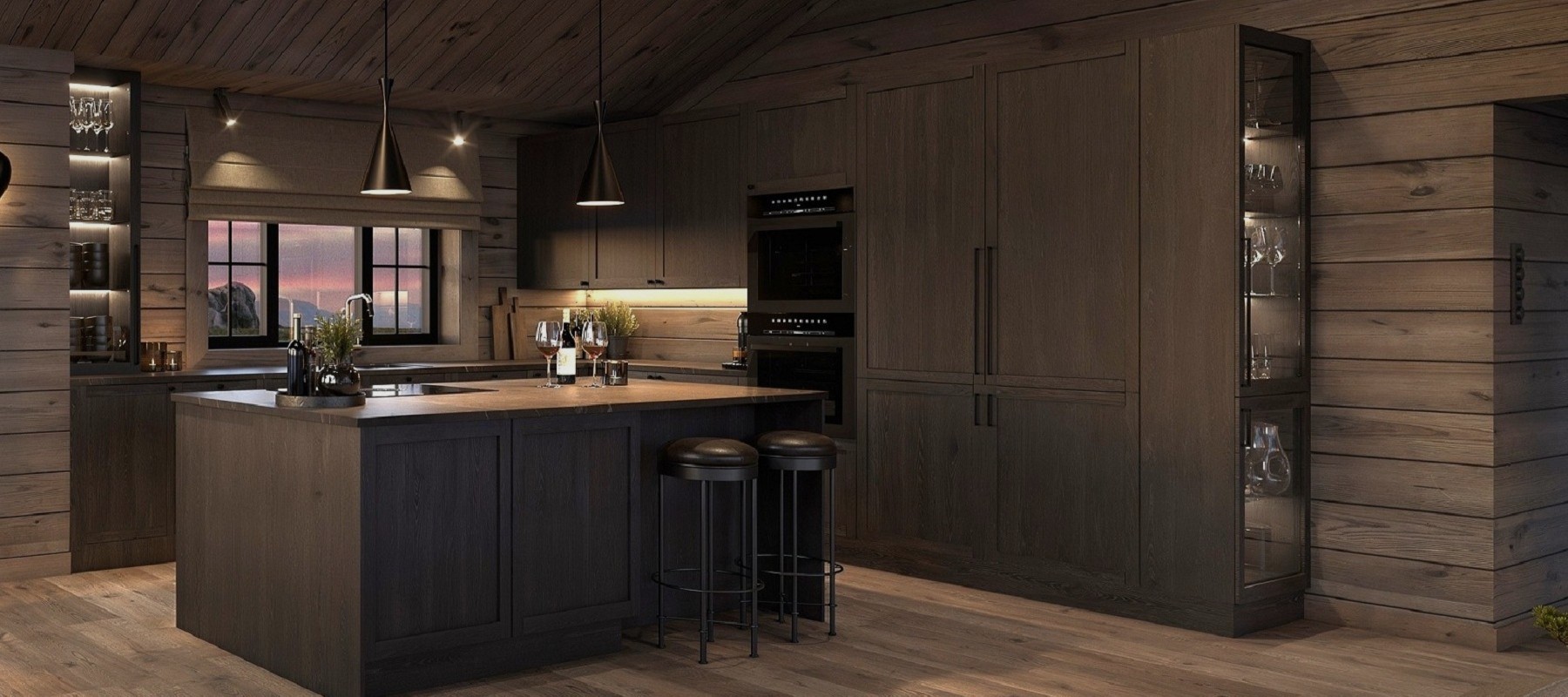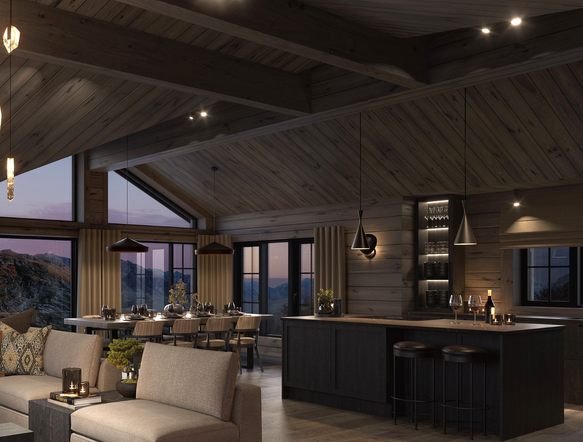 Stor stue, spisestue og kjøkken med åpne skrå himlinger i 2 møneretninger og store glassflater til fjellnatur og himmel. Sosial planløsning med utsiktsvinduer og ildsted i synsranden i både stue, kjøkken og spiseplass. Eksklusivt stort kjøkken med praktisk planløsning. Adkomst til balkong med spisebord og grill fra spisestua.
