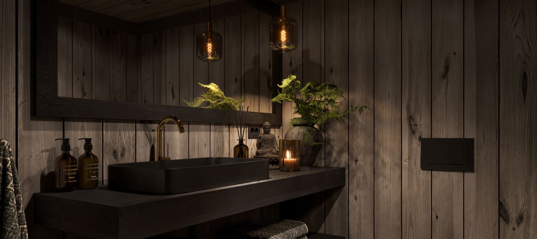Badstue med bad og adkomst til stor overdekket terrasse med sofagruppe og Jackuzzi.